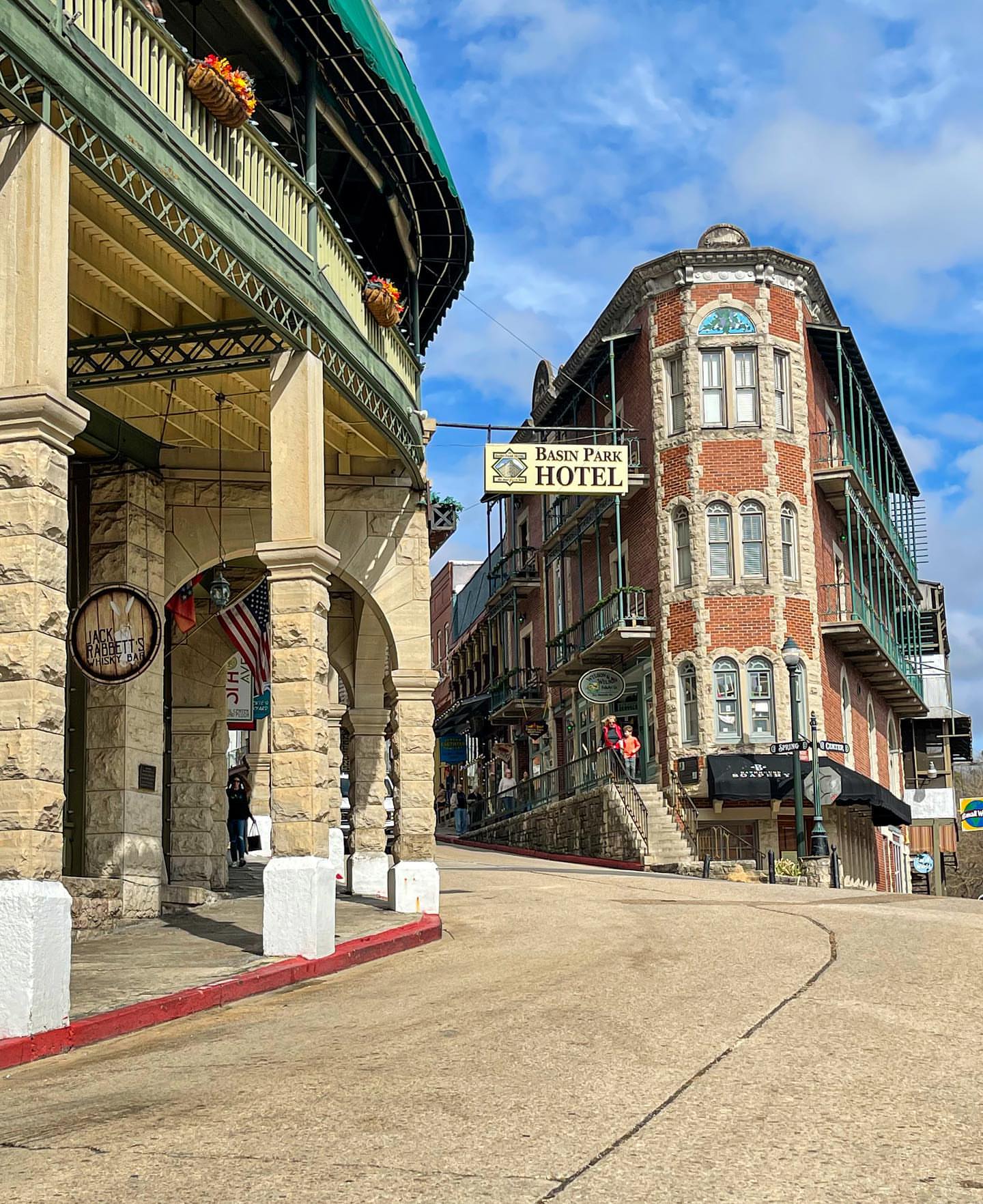 Eureka Springs is built right into the Ozark Mountains. The streets are very winding and steep. No two streets cross at a right angle. It is a very unique place to explore on foot.