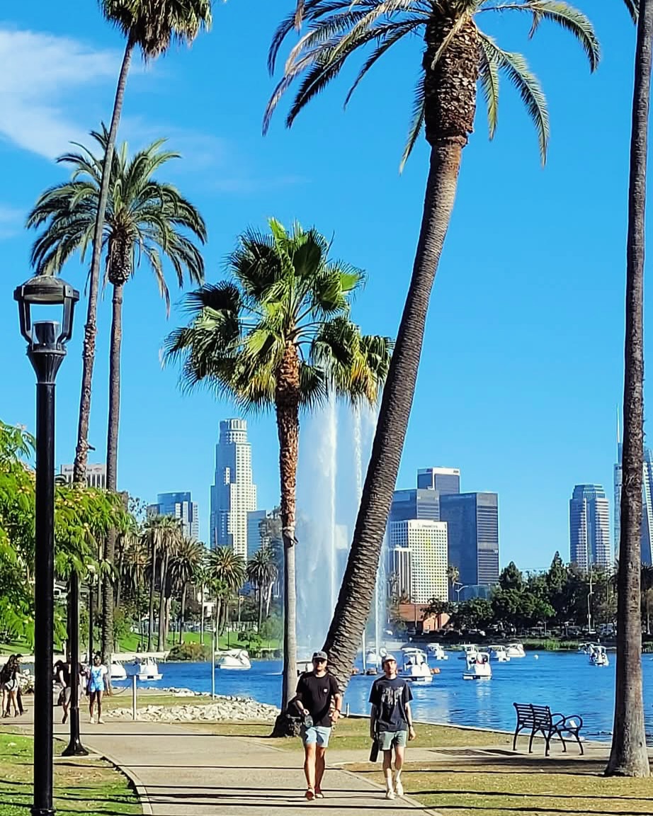 Echo Park Lake is a beautiful spot in Los Angeles where you can walk all the way around the water on a flat path.